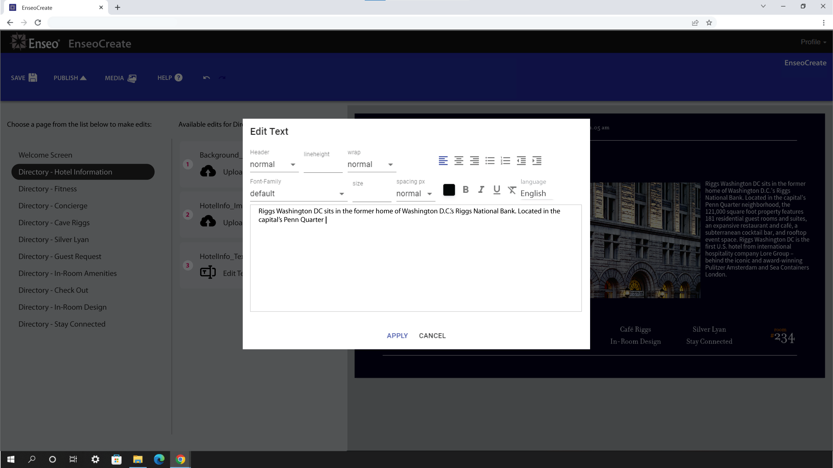 When the time came for Enseo to develop on a product that allowed hotels to edit the information on their TVs within a content management system (images & text), I jumped at the chance to lead the UI and UX for what would be called CORE Create.