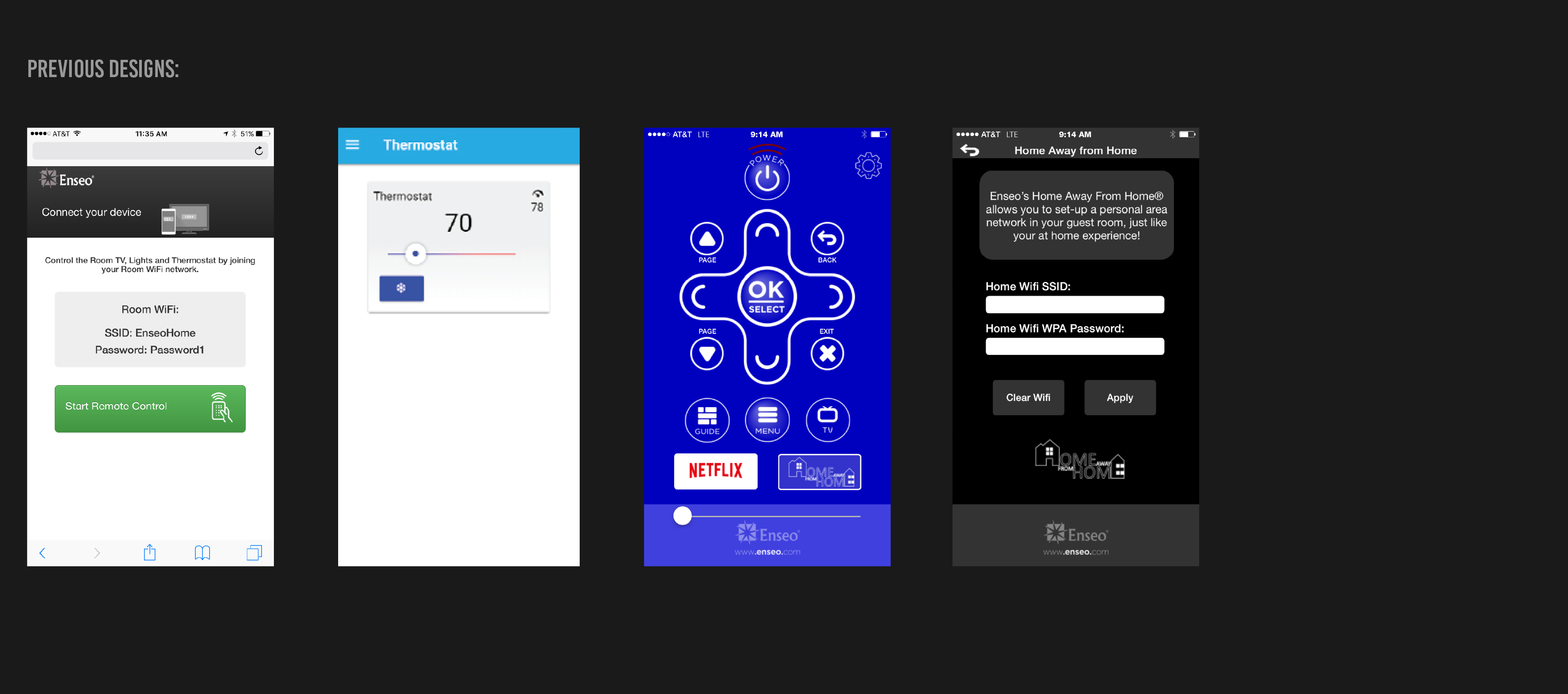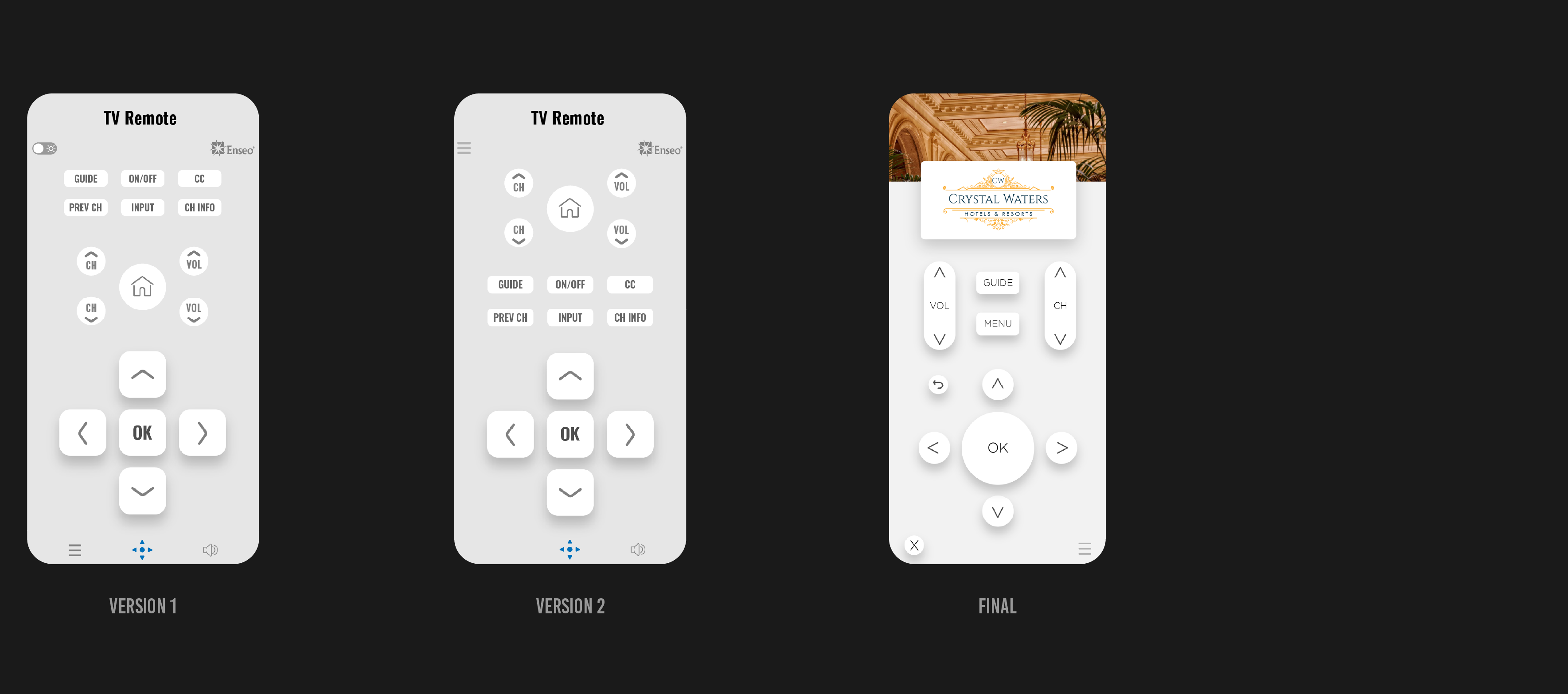 Enseo had explored creating a phone remote for years before I joined, aiming to give hotel guests an alternative to the physical remote. I took the lead on UI development, focusing on simplicity and adaptability to each hotel’s TV system. My process included studying design trends, how people hold their phones, and thumb reach for one-handed use to shape the layout.